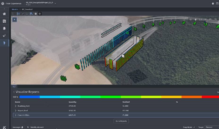 - 材料の定量化を自動化:Bentleyソフトウェアやその他のソースで作成されたプロジェクト、資産データ、ファイル、モデルを自動的に取り込んでデジタルツインに集約し、単一のシンプルなビューを実現します。共通の設計要素をインテリジェントにグループ化し、ワークフローを統合することで、設計ファイルに欠けている正確な材料の体積と数量を自動的に算出し、試算や古いスプレッドシートを排除できます。